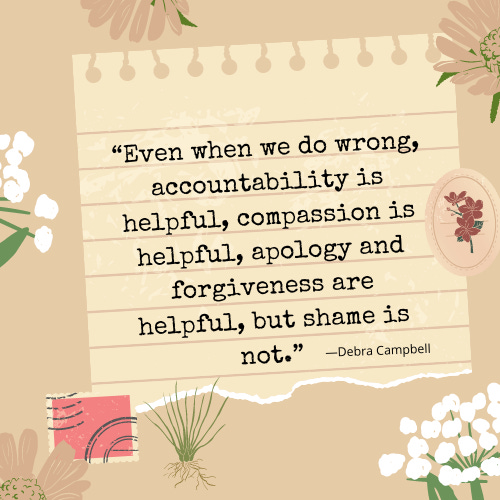 Language matters A LOT. Notice the words you choose when speaking or thinking about things you have done that you feel bad about or find upsetting. Are they describing your behavior (i.e., I feel bad about something I did) or you personally (i.e., I feel bad about who I am)? We can feel regret about something we did (guilt) however we don’t want it to morph into feeling bad about who we are (shame). This is also true in how we speak to others when addressing poor behavior, especially children. If you notice using shame language, what happens if you shift the language to focus on your behavior instead of yourself?